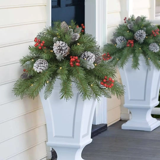 Get into the holiday spirit with the Puleo International Urn Filler. This 18-inch tall bundle of greenery with verdant green pine needles, rich-colored berries, and realistic snow-covered pine cones makes for the perfect inhabitant of your favorite festive urn and perfectly captures the ambiance of the wintry forests in your home. Decorated with 35 pre-attached warm white LED lights, this pre-lit foliage illuminates your home with a dazzling festive glow while eliminating the time-consuming hassle of hanging lights around your house. Powered by three AA batteries (sold separately), this pre-lit urn-filling greenery illuminates your home with a dazzling festive glow, and the timer function conveniently allows you to set a 6 or 18 hour lights-on period. The urn filler has a full and natural appearance with a total of 62 branch tips, gorgeous life-like branches, and a classic conical shape for an authentic wintry forest impression. Assembly is simple and quick– simply secure into the urn of your choosing with the three sturdy stakes, and flip the lights on to supply a near-instant pop of holiday joy! The hypoallergenic and needle-shed resistant branches offer a safer alternative to fresh-cut Christmas greenery, so you can welcome in friends and family for holiday celebrations without worry. This product is backed by a five-year warranty for years of quality use.