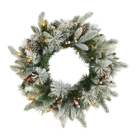 Showcase serious curb-side appeal this holiday with this artificial Christmas wreath designed from seasonal evergreens and completely flocked with faux snow to evoke a winter setting. Pre-strung with clear LED lights to illuminate a wall or door, this decorative wreath makes for an inviting accent all throughout the season.