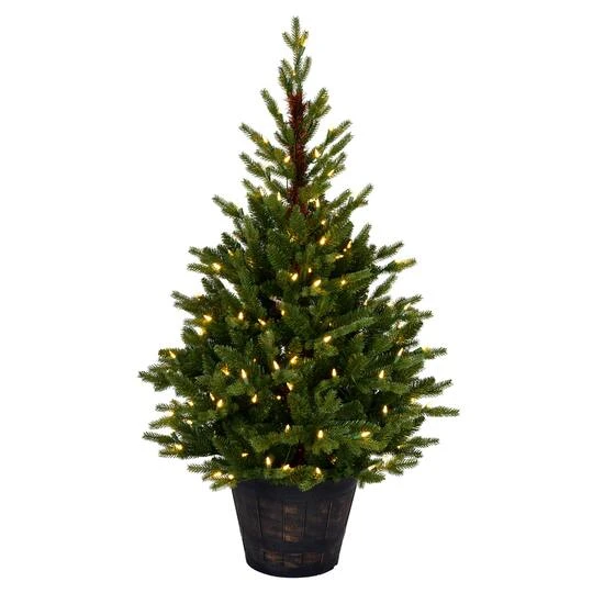 This tree has 200 warm white dura-lit LED lights. It features green PE tips, and is situated in a brown resin barrel. It has dura-lit lights which means when one or more bulbs do not function, the rest of the strand will stay lit.