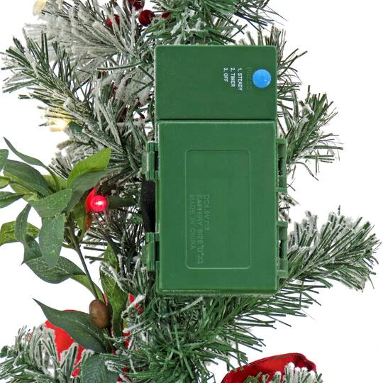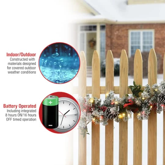This holiday garland features snow-sprinkled evergreen branches flowing along a flexible vine base, trimmed with pinecones, red berries and plaid fabric bows. It is pre-strung with 75 battery-operated warm white LED lights that are energy-efficient and long lasting. Included is an option for 6 hours ON/18 hours OFF timed operation. Also included is a convenient handheld remote to control the lights. This indoor/outdoor garland can be displayed over doors, windows, fireplace mantels, fence, or stairway railings.
