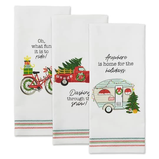 Set of 3 printed dishtowels, 100-percent Cotton Fabric, and machine Washable. Wash with cold water in gentle cycle and tumble dry low. Do not bleach them or run them through a hot dryer. The festive design coordinate with most kitchen décor and add some holiday cheer to your kitchen. Perfect gift for Christmas, party, holidays, birthdays, housewarming and more.
