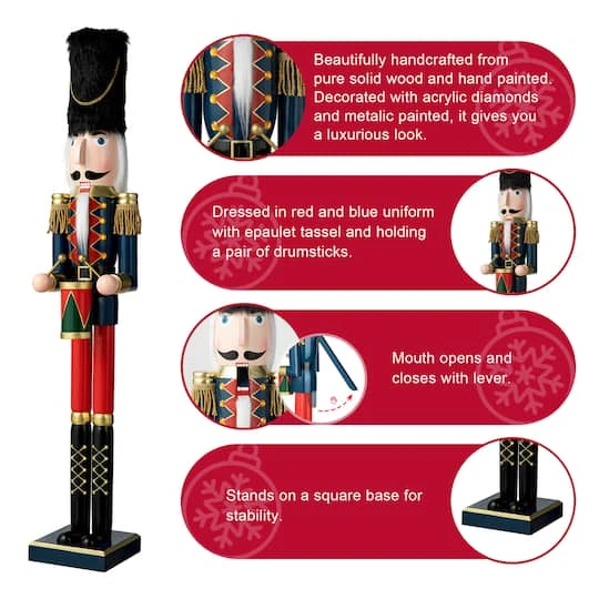 The nutcracker bares its teeth to the evil spirits and serves as the traditional messenger of good luck and goodwill. Dressed in red and blue uniform with epaulet tassel and holding a pair of drumsticks, this ornate drummer nutcracker in top hat is a unique but festive touch to your Christmas or home décor!