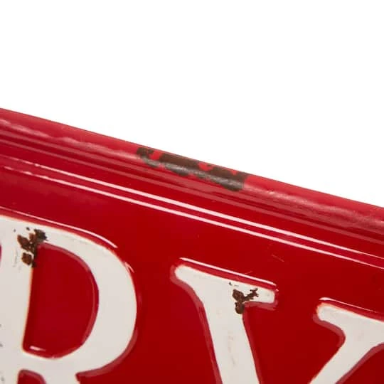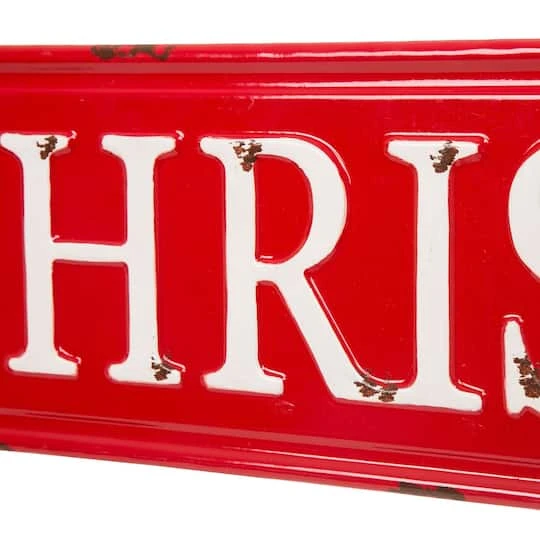 This is a handmade, distressed, Christmas sign that says, “Merry Christmas” in script lettering, painted in red with white lettering.