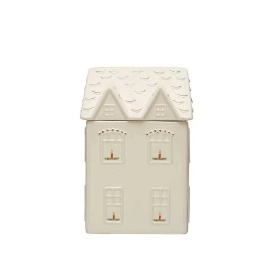 Store holiday goodies in this hand-painted stoneware house cookie jar with gold electroplating, featuring intricate details and vibrant colors for a festive addition to any kitchen.