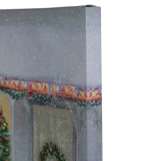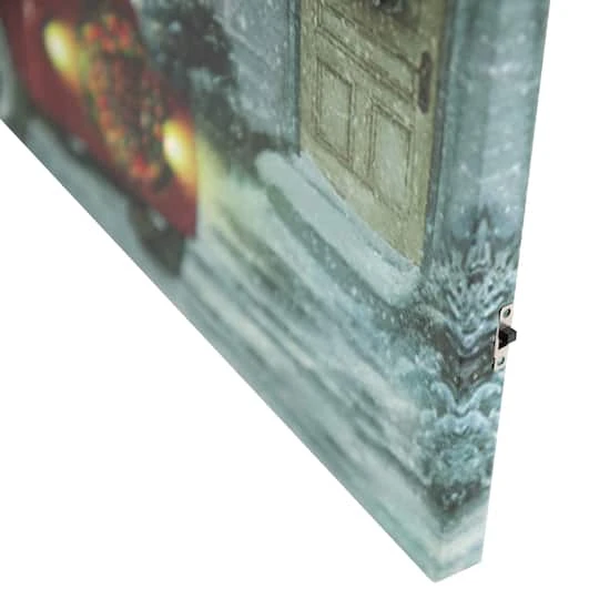 This lovely lighted canvas wall art would be the perfect addition to your holiday décor. Perfect to wow your guests all Christmas season long. Features red retro truck with a bed full of gifts outside a decorated house. Pre-lit with 30 color changing fiber optic lights and 2 LED warm white lights. Comes ready to hang with a sawtooth hook.