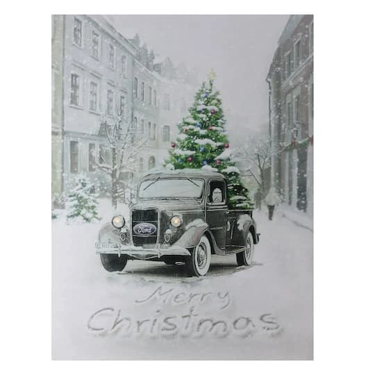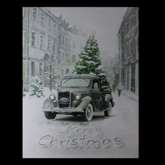 If you are looking for a festive addition to the Ford truck lover in your life look no further! This canvas features an older model Ford truck with lighted headlights carrying home a pre-lit Christmas tree on a snowy day with houses on both sides. This piece will hang perfectly in your living room, dining room or even in your front window. Could make a great addition to your favorite garage! Features Ford truck Christmas wall art. Features the Ford truck riding along a street blanketed in snow with a Christmas tree in the bed of the truck. Pre-lit with 20 multi-color changing Micro LED lights in the tree and 2 amber LED lights in the headlights. This wall art says “Merry Christmas” in the snow. Note: Item does not come with a battery cover – open design holds the batteries snugly