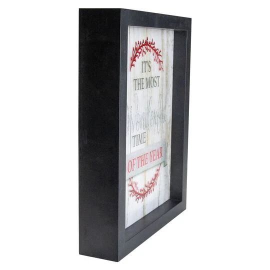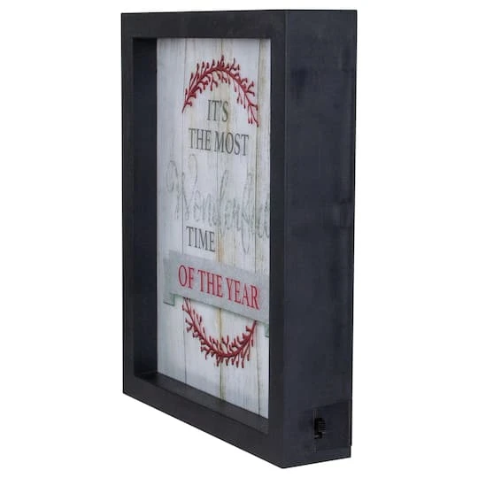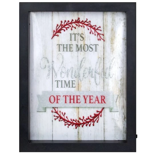 It’s the most wonderful time of the year! Celebrate with a new LED piece of wall décor to feel the holiday spirit! Features a black frame with red berries on a vein the background has a wooden design this frame will be the focal point of your room’s décor with 16 warm white lights that will shine bright. You can add this to your end table mantel or even given away as a gift. Features a black framed Christmas wall décor. Reads “It’s the most wonderful time of the year”. Features red berries on a vine.