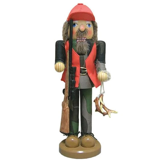 This 14″ Nutcracker is dressed in green and brown camouflage. He has on a bright orange vest and hat. He holds his rifle in one hand, in his other hand he has a pair of deer antlers.