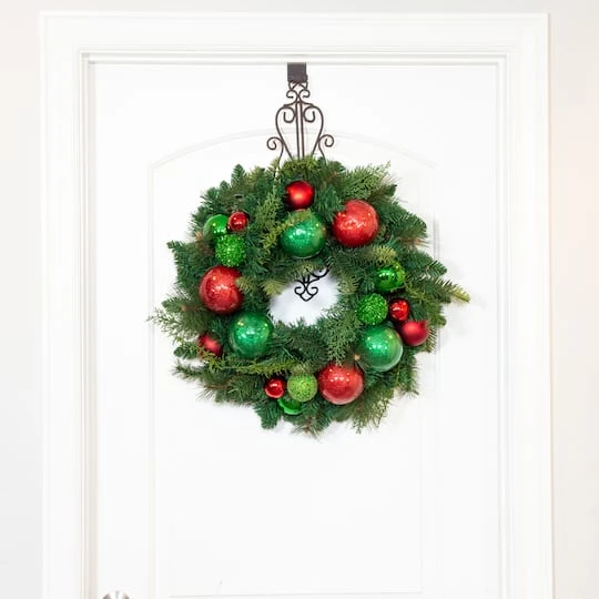 This wreath is a modern 24 in. Christmas wreath which features a handcrafted design complete with red and green ornaments. Enjoy a modern touch on traditional minimalist wreaths that works great as an indoor or covered outdoor wreath.