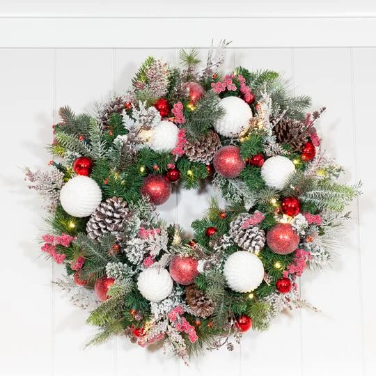 Christmas Wreaths are a must have if you want to impress your guests during the holidays, and this one of a kind wreath is sure to meet those expectations. The Frosted Wonderland Red and White wreath is a pre-lit, remote-controlled, battery-operated Christmas Wreath with 50 LED mini lights. The mini lights are patterned in our candy cane colorway, consisting of red and warm clear lights. It features a handcrafted design complete with frosty red and white ornaments, pinecones, and frost covered red berries and foliage to give a modern touch on traditional Christmas wreaths. The life-like artificial wreath is perfect either indoors or outdoors, whether you want to hang it above your fireplace mantle, or display it on your front door.